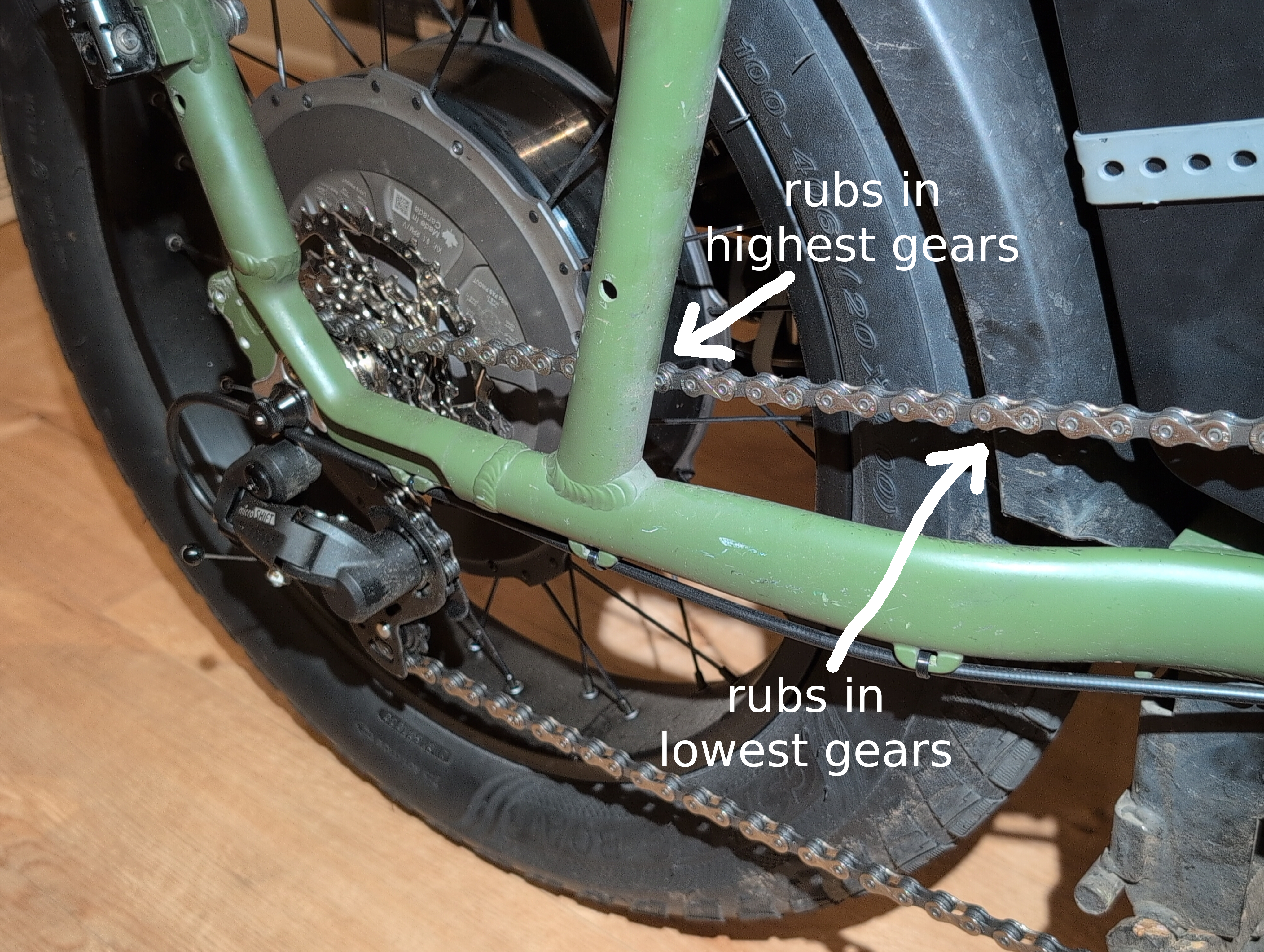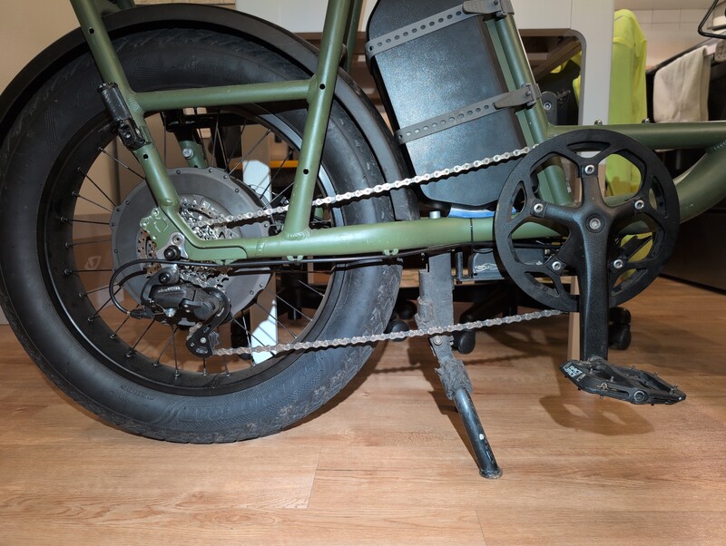 But after moving the chainring inward, now the chain rubs against the fender in the lowest 2-3 gears. I’ll probably cut a notch in the fender to make space. Still, I don’t even need these low gears on an e-bike unless it loses power. I rode it for years as a 52x16 single-speed.