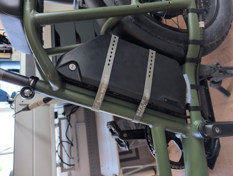 The DP7 battery pack fits on the frame only after temporarily removing the rear wheel and loosening the fender. Unfortunately the slots on the mounting tray only meet two of the frame’s three battery mounting holes. The new tray wants 64 mm-spaced bottle cage mounts, but the RadRunner’s holes are about 110 mm apart, and there is no room for a Triple Bob without further reducing fender/tire clearance. Fortunately, the pack can slide down to rest on the chainstays, providing two more points of stability. I put a piece of high-density foam under the battery to alleviate pressure points on the ABS plastic case. I also put a couple of Voile straps tightly around the pack and seat tube. It’s quite solid and doesn’t wiggle at all. Shame there’s no room for a daisy print canvas bag around it.