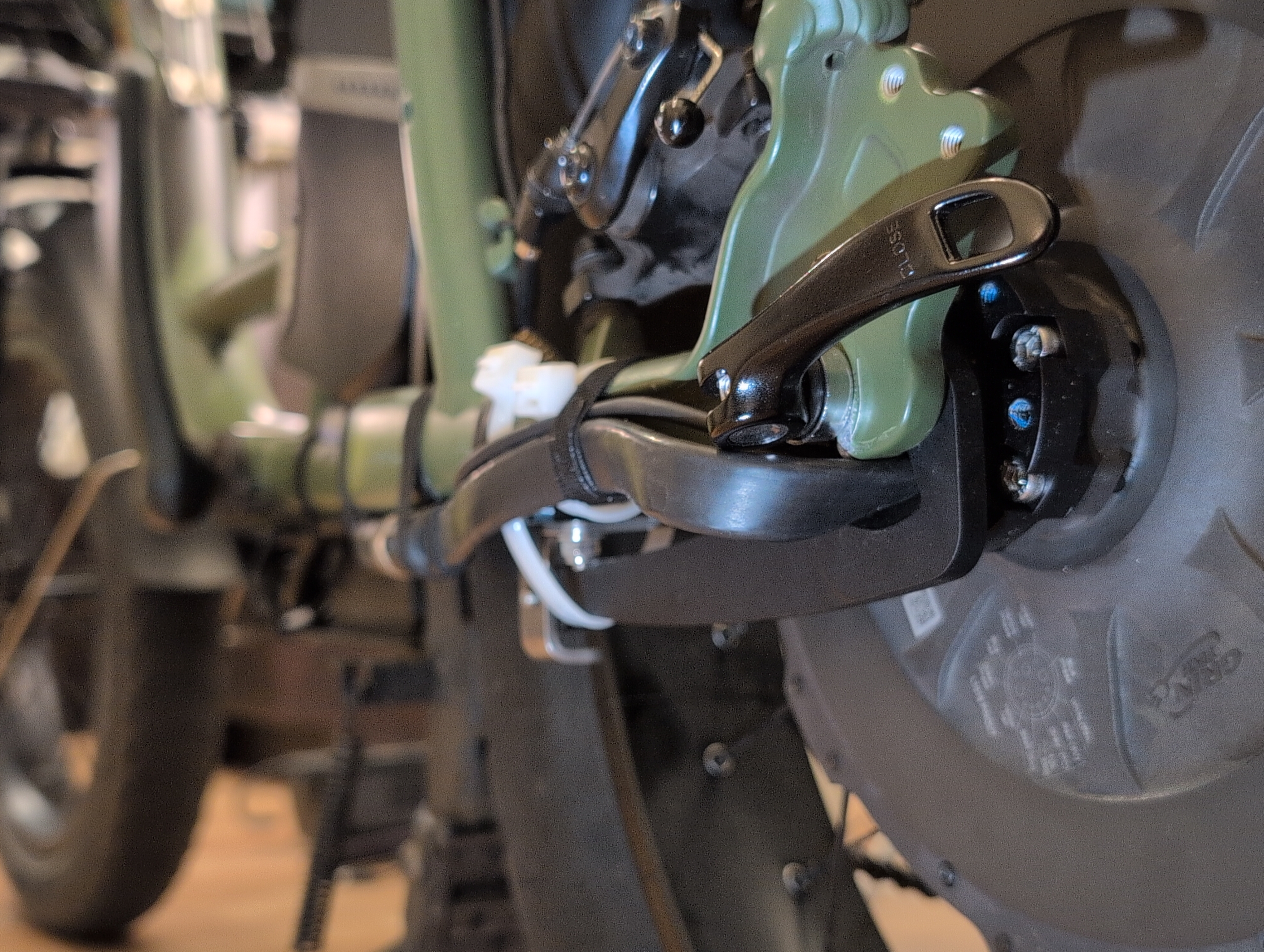 Fortunately I see no exposed conductor, so I don’t think it’s worth the trouble to replace the motor cable. Grin sells discs that are supposed to clear the cable completely, or I could remove some material from the rotor I have. For now, I’m going without. Rear brake is now regen from the Max45, it’s strong enough to skid the rear on wet pavement, and the front brake does most of the work in a panic stop anyway.