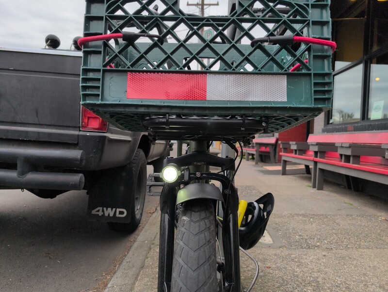 My only nitpick with both lights is there isn’t much sideways spill. This is fine with mounting locations that track with the bike’s steering, but the original RadRunner bracket was on the underside of the headtube-mounted rack, which doesn’t point through corners when you’re taking a turn. I resolved this by moving the light to the fork arch, held on with the included handlebar mount.