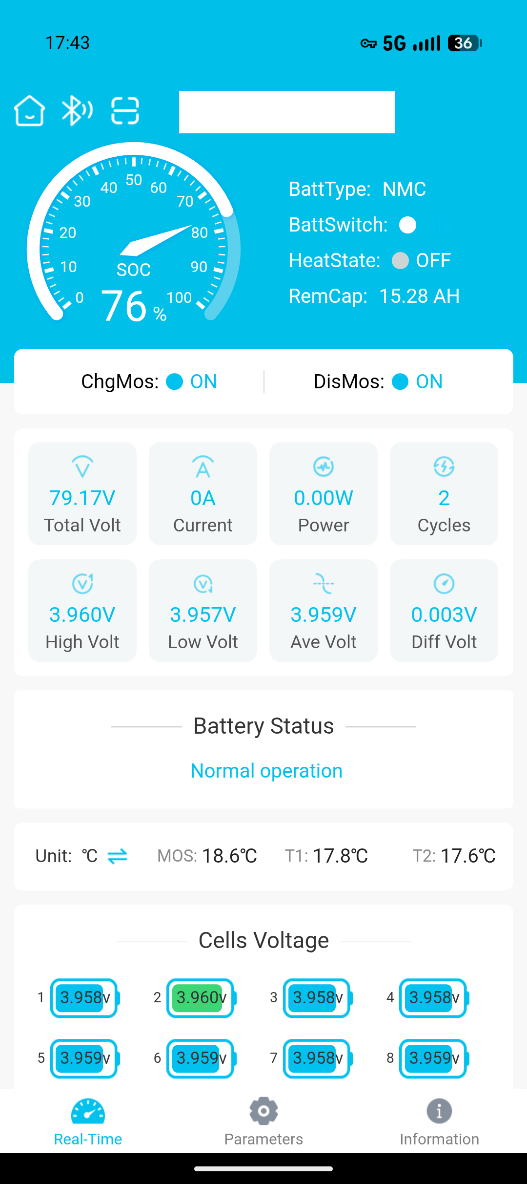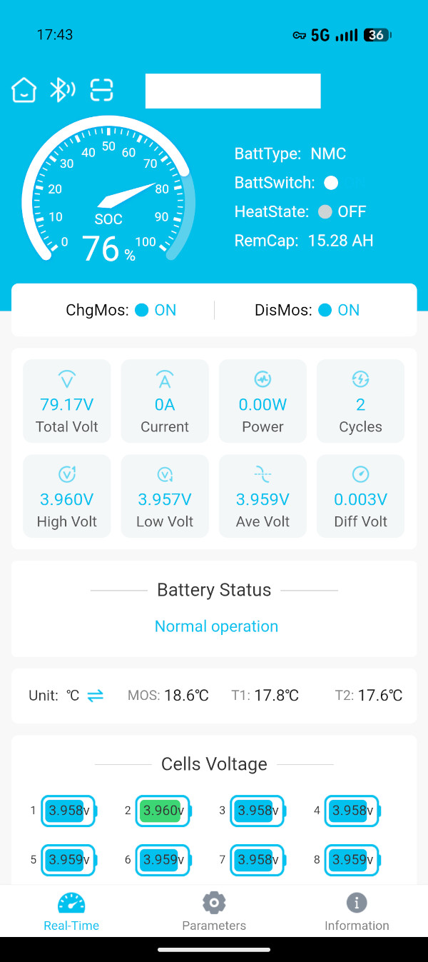 Long story short, the app is presently not allowing me to change (or view) many of the BMS parameters – I have an email in with EBL about this. The app also insists on phoning home to its developer every time it opens (and you must log in with an account) before you can see things like individual cell voltages. It’s unfortunately common for apps to be built this way these days, but it doesn’t respect the user’s privacy or autonomy.