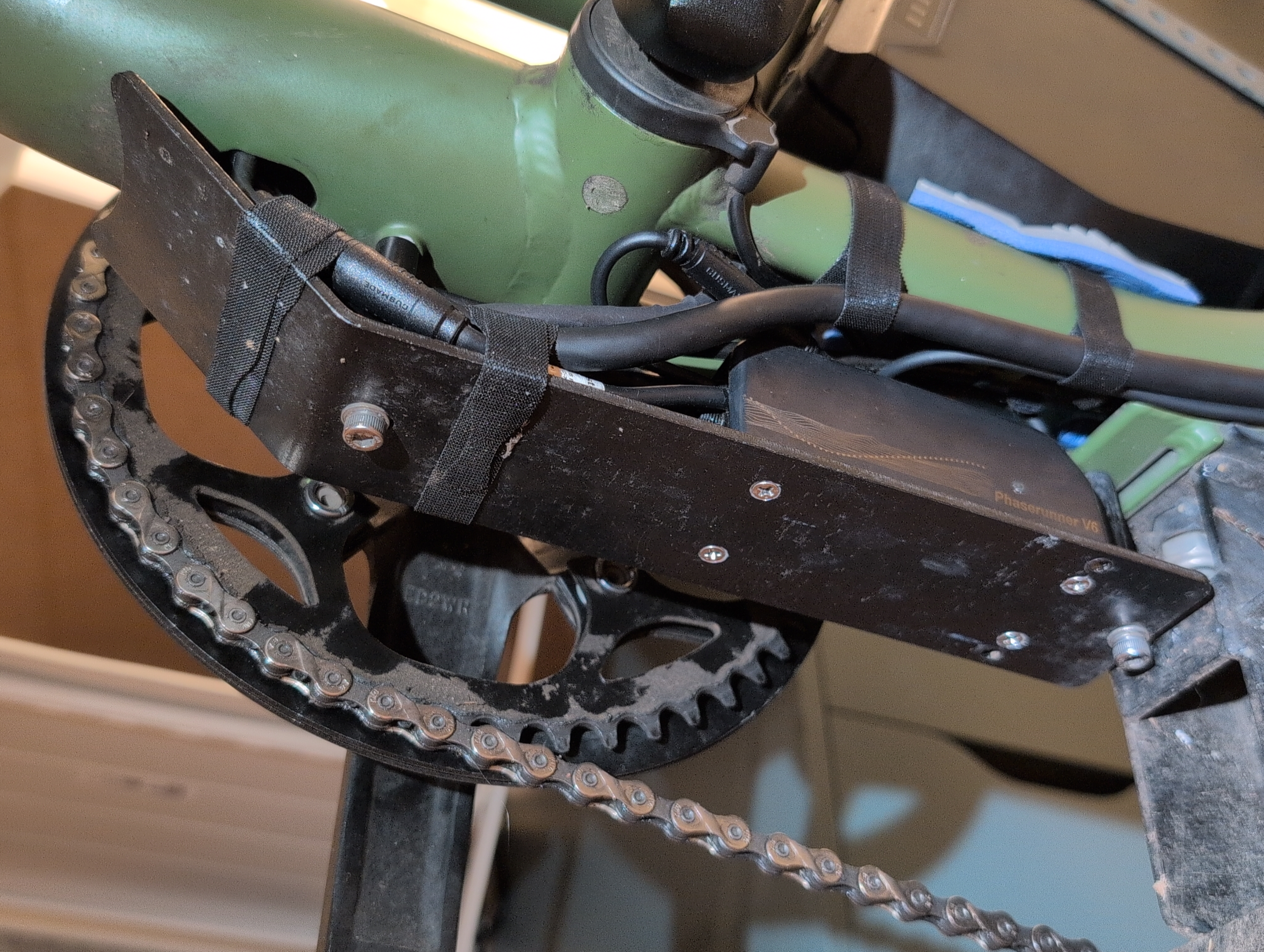 For managing excess cables, the area between the battery, chain stays, and skid plate is well-protected and easy to access. I secured the motor and torque sensor cables under the chainstay with velcro cable ties. I don’t see these on other e-bike builds, but they are great for cables that you’ll need to remove and re-install when (e.g.) fixing a flat tire.