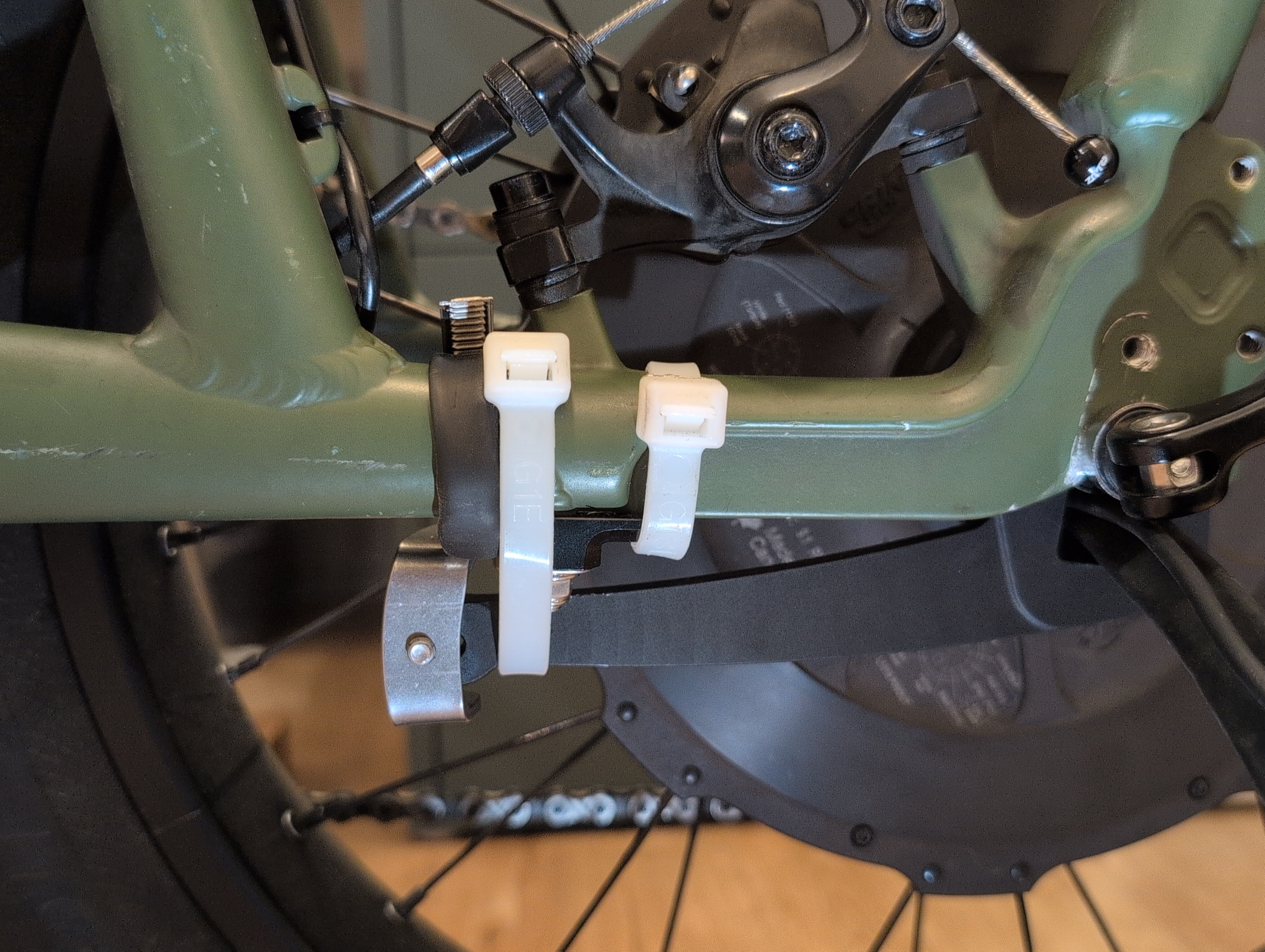 So, I put the frame clamp on backwards. Working around the brake caliper post mount, I got one hose clamp fully on the frame clamp, and one extra heavy zip tie (175 lb. tensile strength, more flexible than hose clamp) halfway onto the other end of the frame clamp. As a backstop, I put another XL zip tie around the torque arm and chainstay. This is not a good long-term solution as UV and fatigue breaks down the plastic in zip ties, but for the moment it is a solid mount, and avoids the forbidden lateral forces on the torque arm.